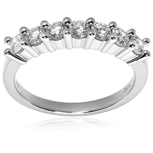 Seven fiery round diamonds, with a total weight of 3/4 carat, form a band of brilliance across the finger in this exquisite seven-stone ring, available in your choice of 14 karat white or yellow gold. The diamonds are held securely in shared prong settings and featured on a slightly squared band with sleek, pure lines and a brightly polished finish. The band tapers in back for comfort. These are fine quality diamonds with a clarity rating of SI2. They are near colorless and have a very good cut that maximizes their reflection of light and, in turn, their brilliance and fire. This classic style has a timeless quality and will look as elegant decades from now as it does today.