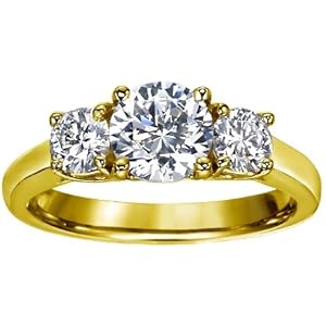 This 14k gold diamond ring is prong set with 3 round diamonds. The total diamond weight is 1 carat. The diamonds are GH color and I1 clarity. The ring band measures approximately 1.80 mm wide and 1.0 mm thick.