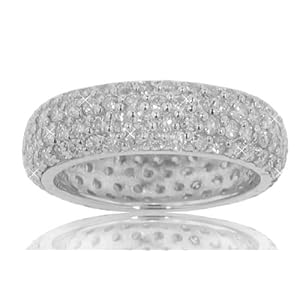 The exquisite sparkle of pave set round diamonds has intrigued many with its alluring endless shine and our ring has a marvelous total weight of 4.00 carat of round cut diamonds all carefully handpicked for exceptionally white F color and immaculately clean to the eye VS-2 clarity. All of these gems are expertly pave set on this 14 karat white gold ring and flow uninterrupted around her finger.