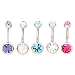 Set of 5 Body Colorz™ brand Double Gem Belly Rings with Swarovski Crystal. 14 Gauge, 7/16", 316L Surgical Steel. You will receive the following colors, identical to the picture: Tanzanite (purple), Aurora Borealis (clear rainbow), Aqua, Clear, Fuchsia (hot pink).