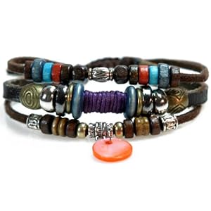 This fabulous leather bracelet has a strand of rugged brown leather with two strands of brown suede. All three strands are filled with colorful wooden beads, bali-style silver beads and a hanging drop of iridescent shell in a coral color. The metal beads range in color from bright silver, brass and gunmetal gray. Adjustable tie fits virtually every wrist size... there is a center knot that the two ties slide between... just pull open the ties (opens to 10 inches around), slip on and then on pull ties to close to desired fit (closes to as small as 6 inches). Arrives in silver foil linen gift box with silver bow.