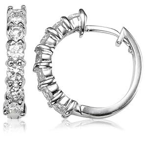 Seven round-cut cubic zirconia stones add sparkle to these small hoop earrings, crafted from polished sterling silver. The stones are held securely in prong settings with polished prong tips. The earrings have a hinged design and are set on posts with hidden snap closures for a seamless look. Showcasing a little more bling than your standard hoops, these pretty earrings are a great way to dress up your everyday look.