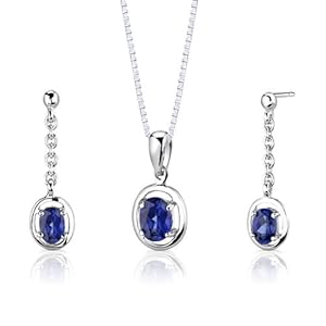Earrings = Lab Created Sapphire, 2 pieces, Oval shape, 6x4mm. Earring Dimensions: 1 x 1/4 inches. Pendant = Lab Created Sapphire, 1 piece, Oval shape, 7x5mm. Pendant Dimensions: 5/8 x 3/8 inches. Earrings and Pendant have a total weight of 3.00 grams and are set in pure Sterling Silver with .925 stamp. Gemstones have a vibrant rich color and eye clean clarity. The Pendant and Earrings feature top quality workmanship and a beautiful finish. Includes Free 18 inch Sterling Silver Box Style Chain, Free Ribbon Gift Box and Free Shipping.